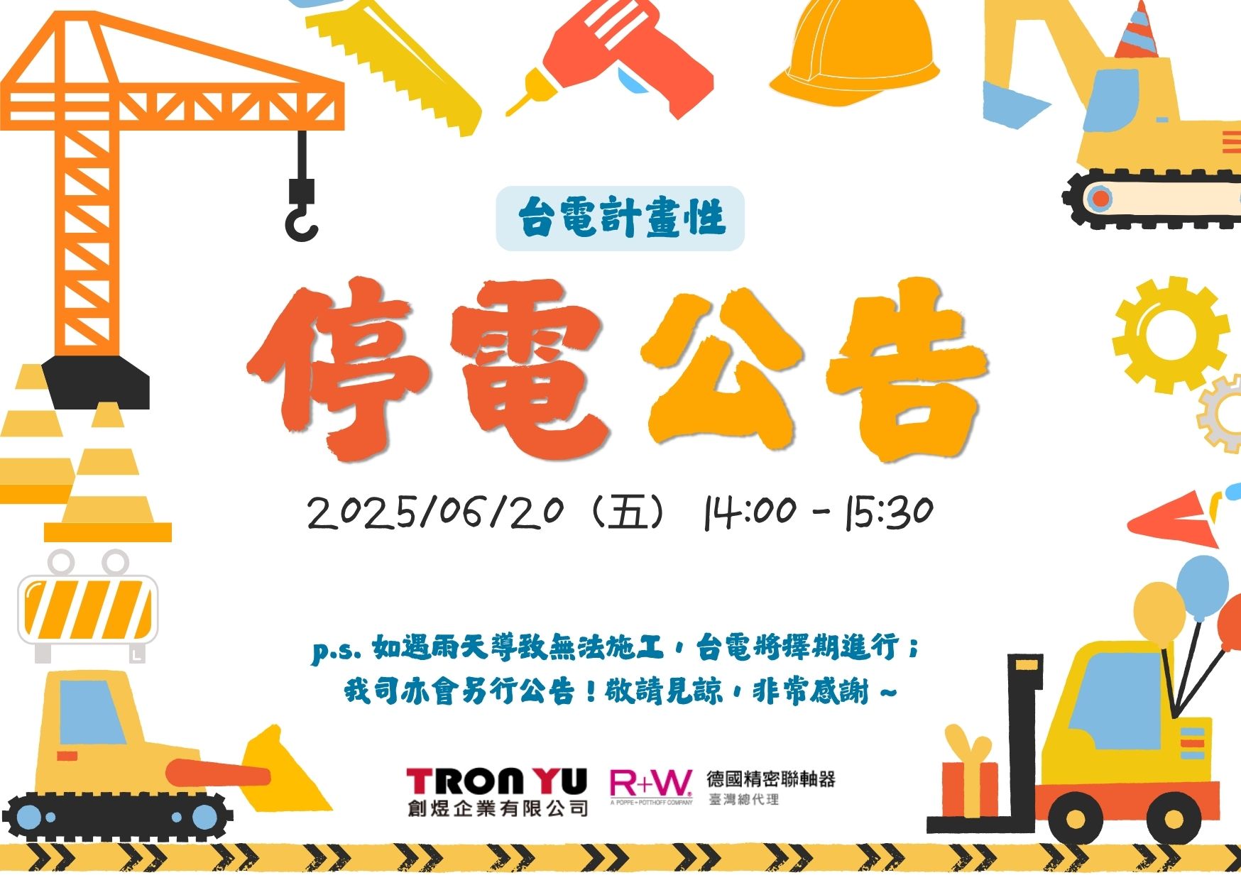 我司將於 2025/06/20(五)14:00 - 15:30 暫時停電。